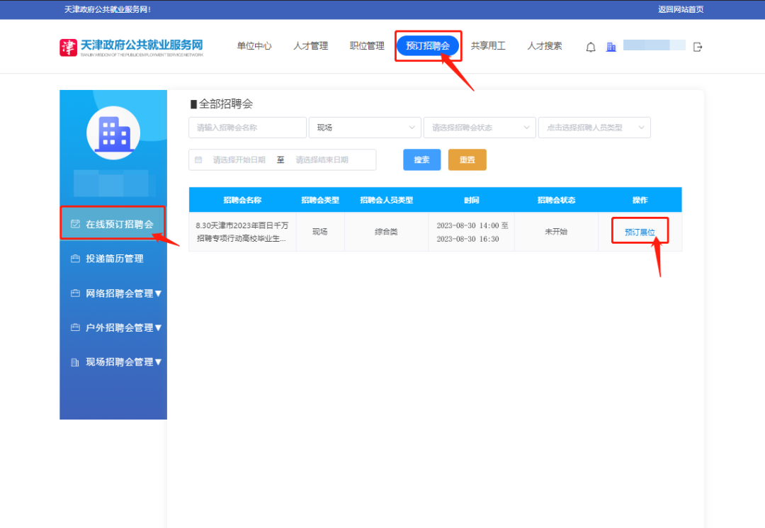 1、参会单位登录http://job.hrss.tj.gov.cn/,点击顶部导航栏“单位中心”。在“预订招聘会”中找到名称为8.30天津市2023年百日千万招聘专项行动高校毕业生专场招聘会并点击进入会场页面,点击“预订展位”。
